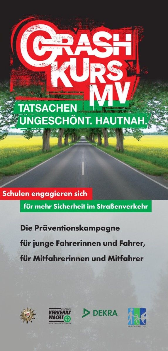 CrashKurs MV ist ein Präventionsangebot der Polizei, der Landesverkehrswacht und weiterer Partner. Ziel ist, die Zahl von schweren Verkehrsunfällen mit jungen Fahrerinnen und Fahrern nachhaltig zu verringern.