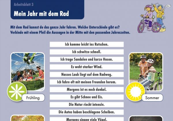 Auf dem dritten Arbeitsblatt stehen die Jahreszeiten im Mittelpunkt und was beim Radfahren im Frühling, Sommer, Herbst und Winter beachtet werden sollte. Die Begriffe bzw. Sätze werden den passenden Jahreszeiten zugeordnet oder sie werden ergänzt. Die Sammlung kann in Partnerarbeit oder in der Tischgruppe erfolgen.
