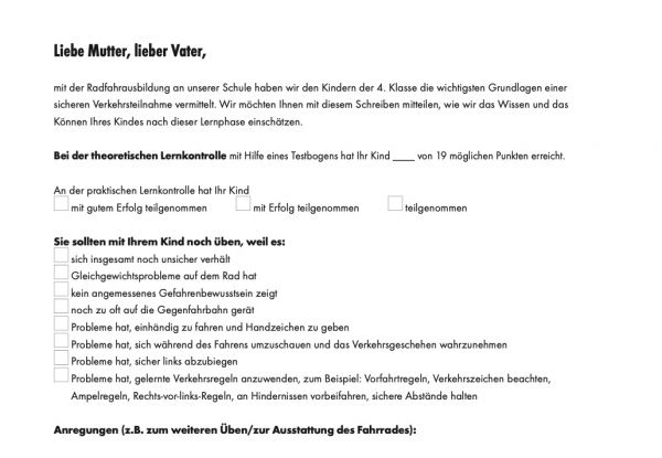 Der Brief an Mütter und Väter beinhaltet die Darstellung der Lernzielergebnisse bei der theoretischen und der praktischen Radfahrausbildung. Wenn Sie die Eltern über das Wissen und die Fähigkeiten ihrer Kinder informieren, können diese ihre Verantwortung für die Radfahrausbildung bewusst(er) wahrnehmen.