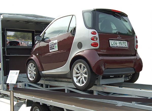 Die Testperson steigt in einen Smart, der auf einem Anhänger fest verbaut ist. Auf dem Monitor werden nach dem Anlegen des Sicherheitsgurtes alltägliche Fahrsituationen im Straßenverkehr einschließlich typischer Unfallsituationen gezeigt. Der simulierte Verkehrsunfall kann durch rechtzeitiges Bremsen verhindert werden. Anderenfalls erfolgt ein Anprall bei ca. 12 km/h.